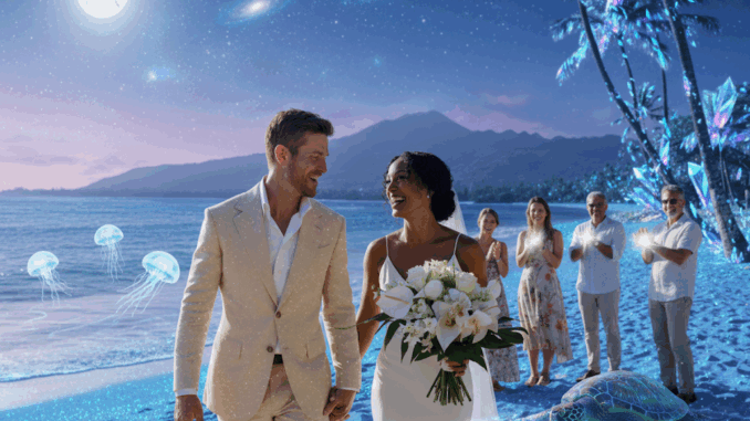 The officiant, Moe Alaiafune, added Hawaiian and Polynesian traditions, including the Honi—a ceremonial sharing of breath—and a blessing in the Hawaiian language.