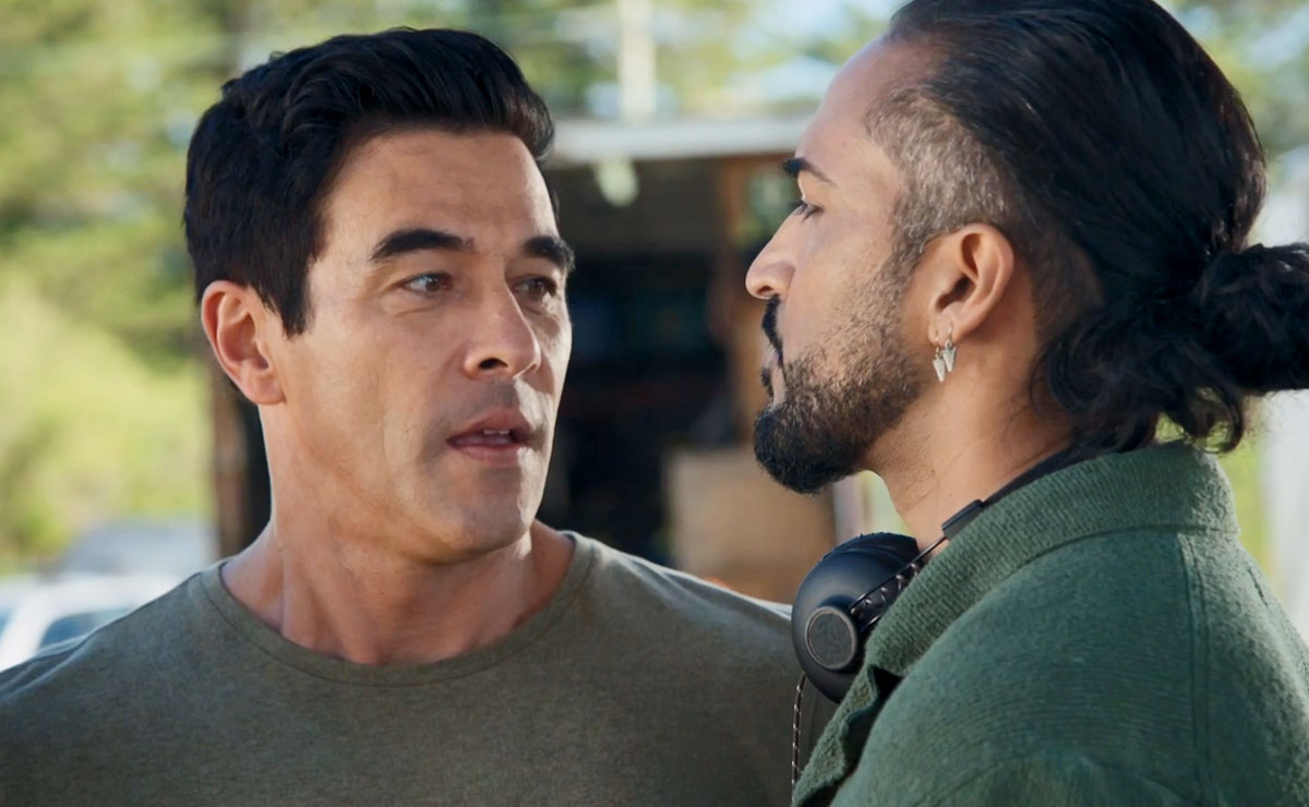 But then Nelson spies someone who could be just right… Justin (James Stewart), who’s busy bemoaning the fact that he can’t go for his morning surf as he approaches the set with Leah (Ada Nicodemou) and Theo (Matt Evans).
